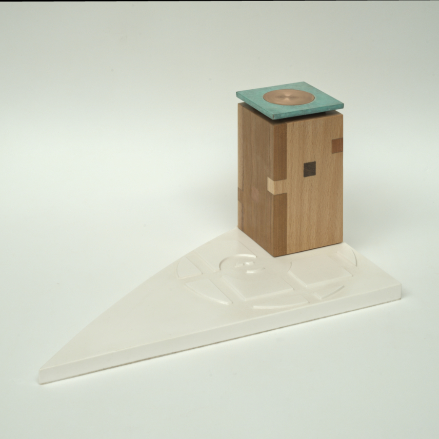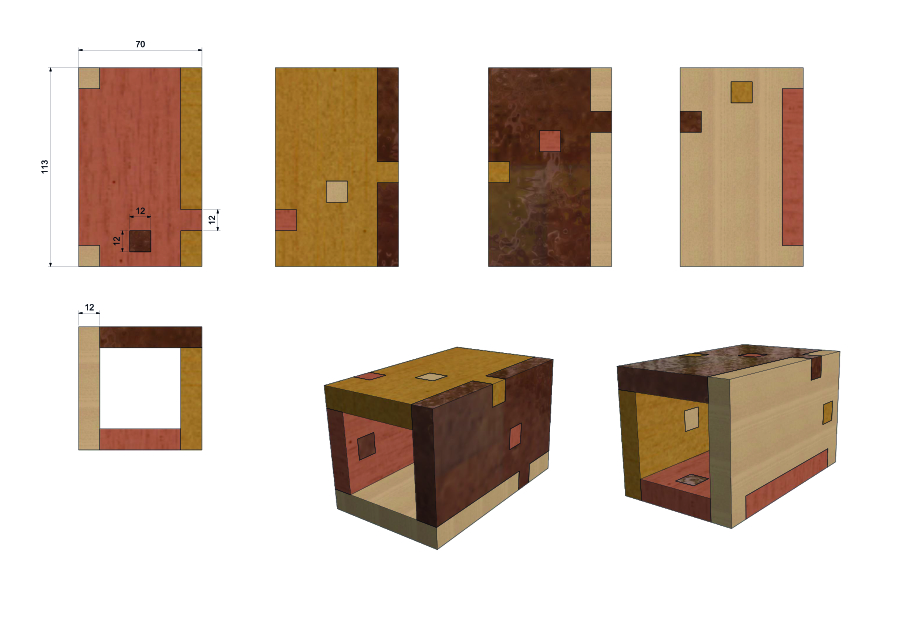 Het tweede cadeau is een abstracte versie van een gebouw. De vier muren, opnieuw in de gulden snede verhouding, zijn gemaakt van vier soorten en dus vier kleuren inlands hout. Peer, beuken, kers en noten. Onderling verbonden door een tand-verbinding. Heel traditioneel maar met deze precisie alleen mogelijk door de watersnij-techniek.
