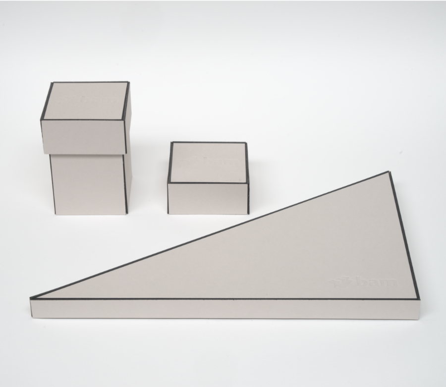 In blinddruk is op de deksels van deze dozen het beeldmerk van BAM zonder de drie letters B-A-M gepreegd. Ook drie blokjes als een drie-eenheid.