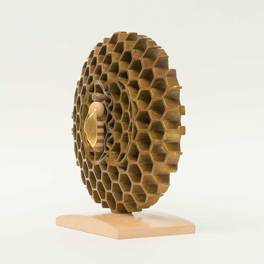 Mijn opdrachtgever vertelde mij over zijn compagnon. Hoe hij denkt en werkt. Dat deed me denken aan de wonderlijke vermogens van de honingbij en daaruit is dit beeld ontstaan dat hij bij zijn afscheid cadeau krijgt.