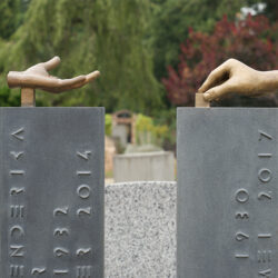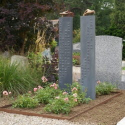 Grafmonument voor een echtpaar Twee zuilen in gezoet zwart graniet met daarop een bronzen hand. Hoogte 120 cm. 1 april 2017 in Een grafmonument maak je samen graniet ← Vorig bericht Volgend bericht →