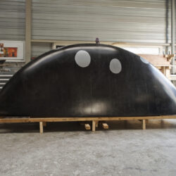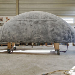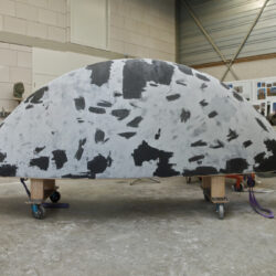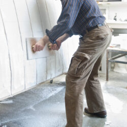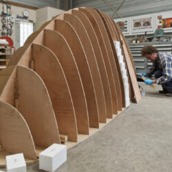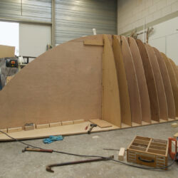 Door eerst een konstructie van multiplex te maken ontstaat een stevige vorm waar tussen stukken polystyreen worden gelijmd. De multiplex geeft houvast om bij het schuren van de polystyreen tot de juiste vorm te komen. Het gehele oppervlak wordt geplamuurd met een epoxyplamuur, dat na uitharding, wordt geschuurd. Het plamuren en opnieuw schuren wordt herhaald tot dat de vorm een preciese vergroting is van het ontwerp. Omdat het oppervlak niet sterk is worden er drie lagen glasvezelweefsel met epoxy over aangebracht. Hierdoor ontstaan opnieuw oneffenheden. Het plamuren en opnieuw schuren begint opnieuw.