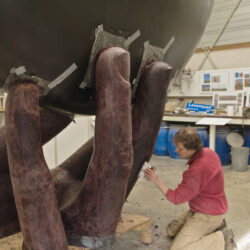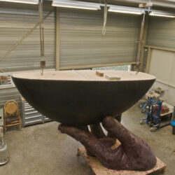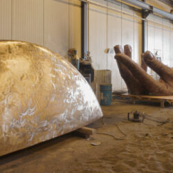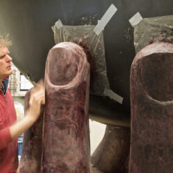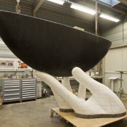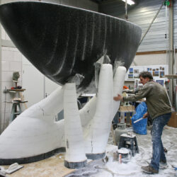 Ondertussen is de kunststof boot terug op het atelier. Opgehangen op de juiste hoogte onder de juiste hoek. Daaronder een houten vlonder waarop de vingers komen. Eerst in piepschuim bekleed met gewapend epoxy. Daarover was om tot de goede vorm te komen.