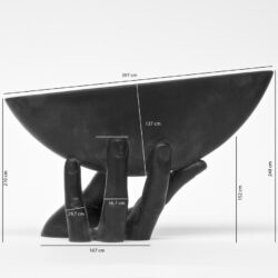 Mij is gevraagd de geschiedenis van de plaats Almere, terug tot die van de Zuiderzee toen nog vele handelsschepen als de Kogge in het gebied voeren, op een moderne wijze te verbeelden. Die handelsschepen heb ik niet letterlijk op een illustratieve manier willen vormgeven maar via een algemeen symbool voor een varend voertuig. De hand, die het schip draagt, is in beweging. Hij is als een filmbeeld stilgezet in het heden, als moment van reflectie. De beweging komt vanuit het verleden en gaat naar de toekomst toe. Het moment waarop deze beweging is gevangen laat zien dat wij ons erfgoed hoog houden. Er trots op zijn. Dat het schip nu in de lucht hangt geeft de associatie met de weggevallen Zuiderzee en dat wij nu leven op de bodem daarvan, het maaiveld waaruit de hand oprijst.