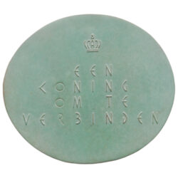 De tekst die ik had gekozen ‘Een Koning om te verbinden’, heb ik keer op keer uitgetekend binnen het ovaal. In de eerste serieuze versie waren de letters op sommige plaatsen met elkaar verbonden. Gaandeweg zijn die verbindingen, die als soort versiering werkten, verdwenen. Ik vond het belangrijker dat het sober werd. Geen toeters en bellen, maar wel verfijnd.