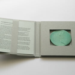 Het leek wel of de rechterkant van de tekstzijde, die wat boller is dan de linkerkant, al een beetje het reliëf van de zijkant van zijn gezicht had. Daardoor vloeide zijn profiel moeiteloos samen met het rechter deel van de ovaal. Heel natuurlijk.